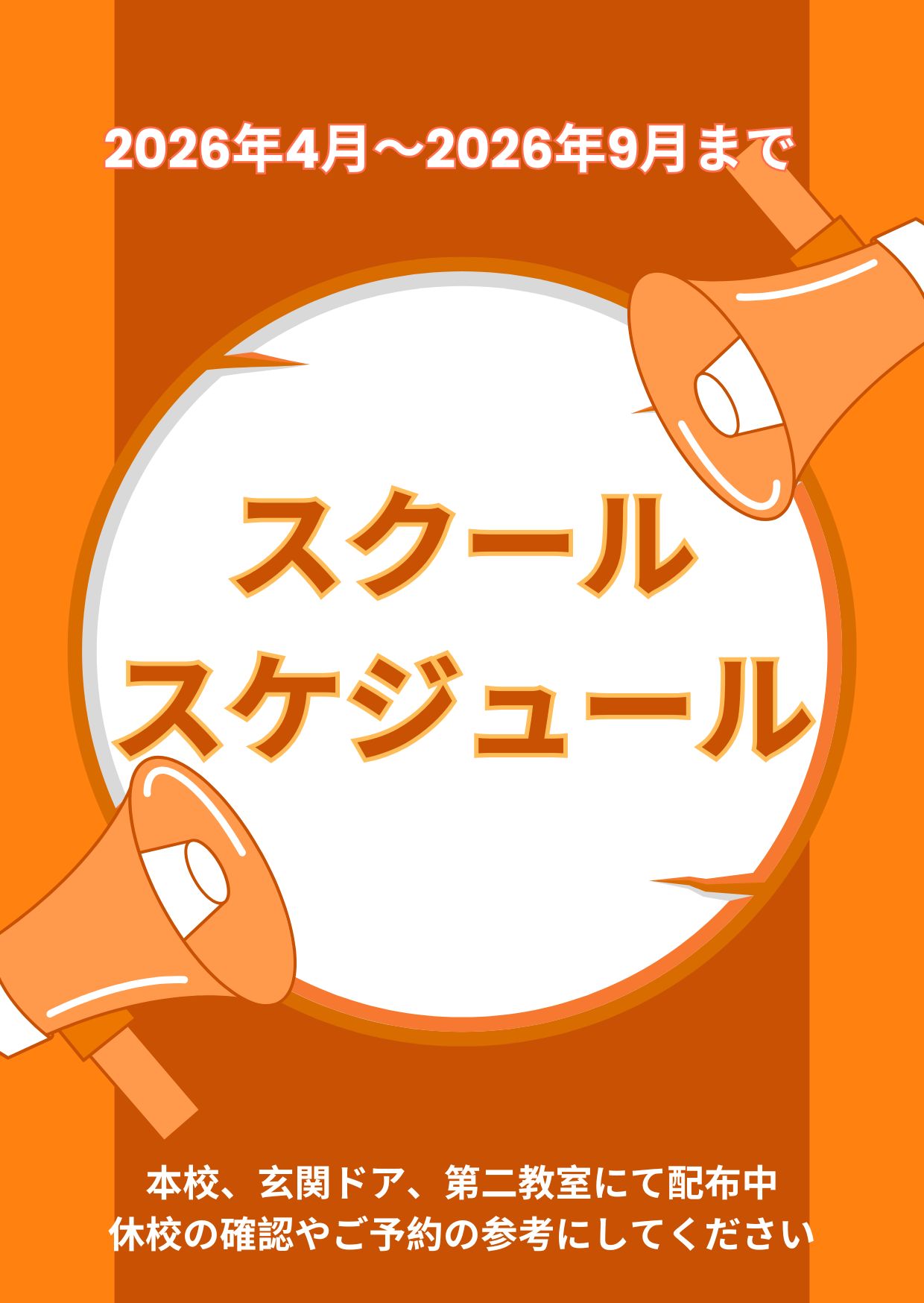 4月から9月までの半年間のスクールスケジュールが出ました。本校と第二教室に置いてありますのでご自由にお取りください。